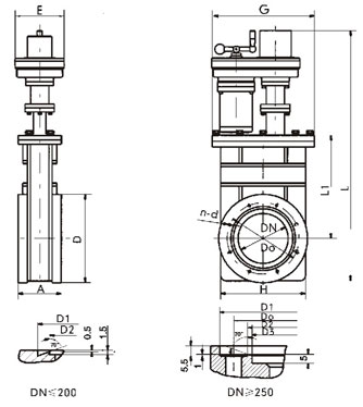| Model 型號 | DN | A | H | D | Do | D1 | D2 | D3 | L | L1 | G | E | n-d | 法蘭標準 |